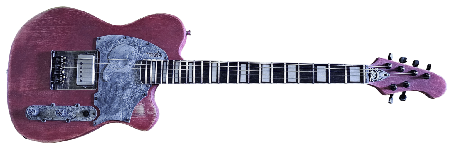 Built specifically for my band Sparrows Eat Crows, this guitar is a direct reflection of our artwork and branding. It’s my workhorse, the one I rely on for both live shows and recording. With an EMG 57TW and a push-pull for single-coil splitting, plus a TKO killswitch for all the stutter effects I need, this beast delivers everything. It’s super light but monstrous in tone, and plays smoother than anything I’ve touched. I’m damn proud to share this with the world.