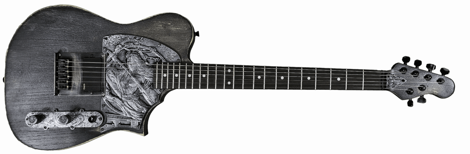 Inky was my first guitar build, starting with a DIY kit, and it’s where I first fused 3D printed art with the classic wood body of an LP-style guitar. The beast comes to life with a LED light set behind the Kraken, embedded in resin, that pulses as this monster shreds. It’s not just a guitar; it’s a piece of art that screams with power, adding a whole new dimension to every riff.
