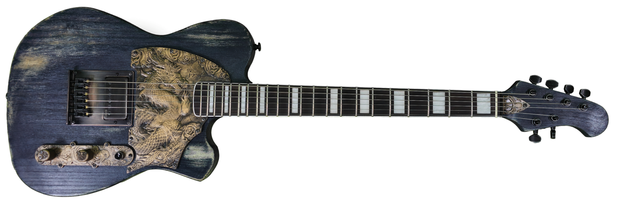 This beast of a guitar is my first build ready to sell to the public. It’s the culmination of years of relentless refinement, honed into a weapon of mass riffage. With a hand-aged, battle-worn look and the antique golden Ink dragon, it stands as both an instrument of raw power and a piece of art. Packed with the fearsome EMG 57TW and the TKO killswitch, this axe is engineered for shredding and crushing brutal tones. The push/pull option lets you switch from a twangy spank akin to a Telecaster to the bone-rattling, face-melting heaviness that EMG active pickups are renowned for.